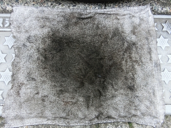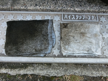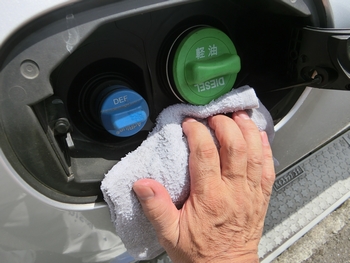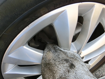 タイヤにスプレーしたときに、ホイールに飛び散ったP8コートを利用して、タオルで汚れを拭き取ってゆきます。 |